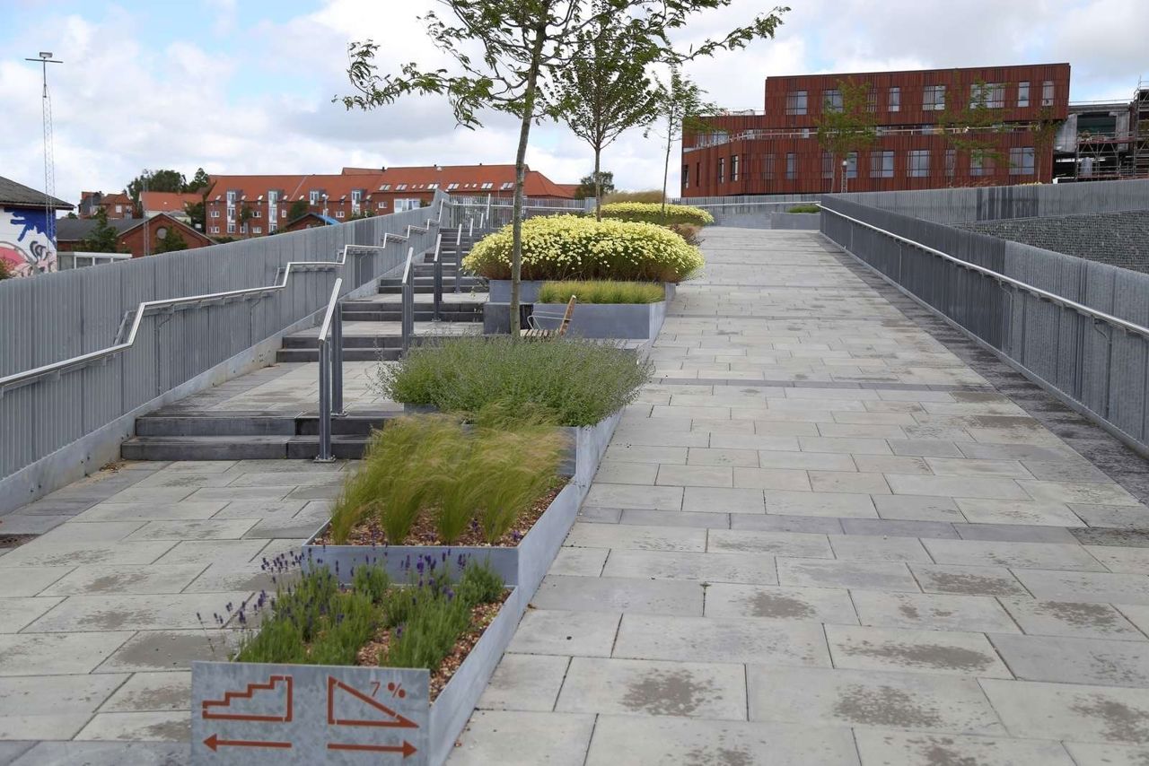 Hærvejsbroen er en stiforbindelse for gående og cyklister over jernbanen, der binder Banebyen sammen med bymidten. Du kan komme ned på stationen fra broen.