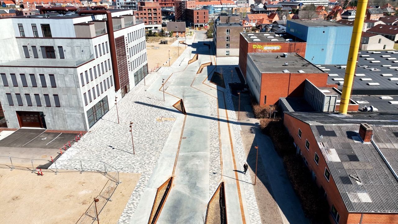 Hærvejsstien er anlagt med store lyse betonflader, træer, stauder, urter og siddemuligheder, der indbyder til ophold undervejs.