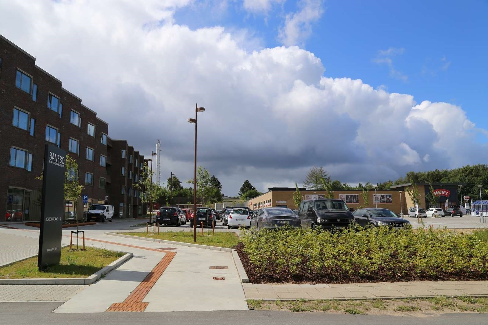 Hærvejsstien er anlagt med store lyse betonflader, træer, stauder, urter og siddemuligheder, der indbyder til ophold undervejs.