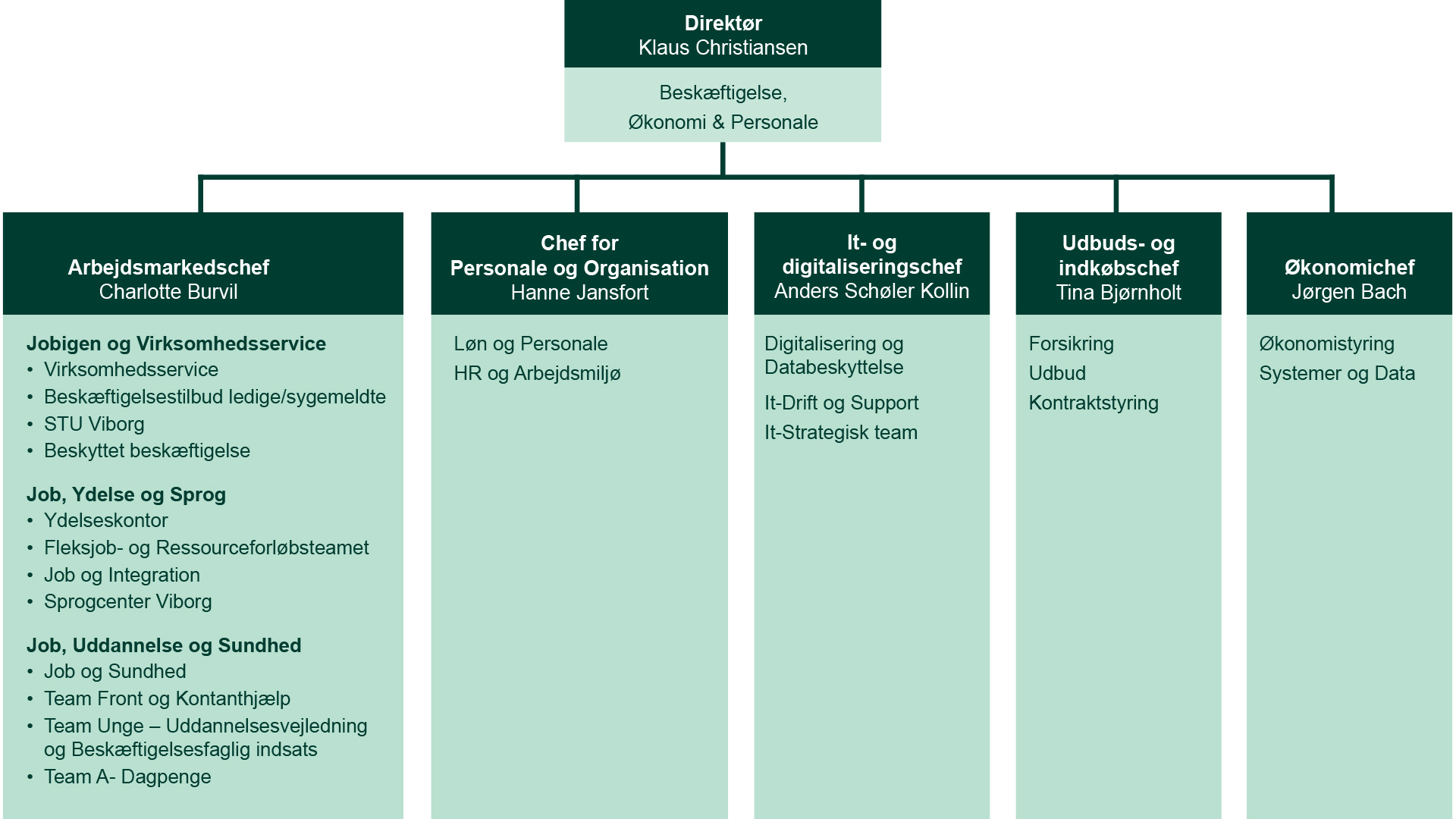 ForsideOm kommunenOrganisationBeskæftigelse, Økonomi & PersonaleOrganisationBeskæftigelse, Økonomi & PersonaleBeskæftigelse, Økonomi & PersonaleDirektørområdet arbejder med arbejdsmarked, personale og organisation, it og digitalisering, udbud og indkøb samt økonomi.senest opdateret 3. februar 2025Organisering i Beskæftigelse, Økonomi & PersonaleCharlotte Holkgaard BurvilArbejdsmarkedschef87 87 49 00cbu@viborg.dkHanne JansfortChef for Personale og Organisation93 59 80 45haja@viborg.dkAnders Schøler KollinIt- og digitaliseringschef87 87 41 50akol@viborg.dkTina Fredsgaard BjørnholtUdbuds- og Indkøbschef87 87 89 76tbj@viborg.dkJørgen BachØkonomichef87 87 89 56job@viborg.dk